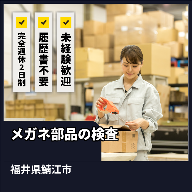 給与詳細 月収例 197,000円 時給例 1,120円 勤務地 福井県鯖江市 仕事内容 メガネのフレームに使用される部品を検査。