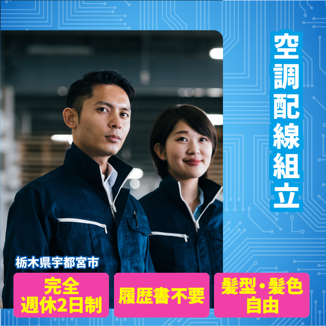 給与詳細 月収例 239,850円 時給例 1,230円 勤務地 栃木県宇都宮市 仕事内容 空調機家電の配線組立。5本程の配線から出ている2~3㎜レベルの銅線を親指の爪くらいの基板に差す、機械にセットしボタンを押し機械がはんだ付けする、配線が外れ居ていないか目視検査。セル作業