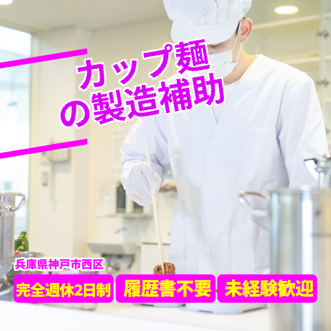 給与詳細 月収例 234,000円 時給例 1,200円 勤務地 兵庫県神戸市西区 仕事内容 カップラーメンの製造ラインで、以下の作業を担当していただきます。