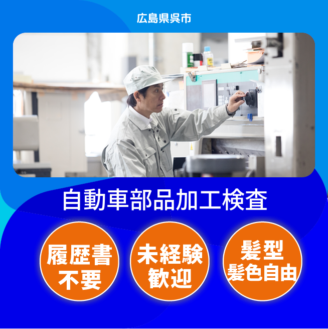 給与詳細 月収例 271,250円 日給例 13,563円 勤務地 広島県呉市 仕事内容 自動車部品の機械加工
