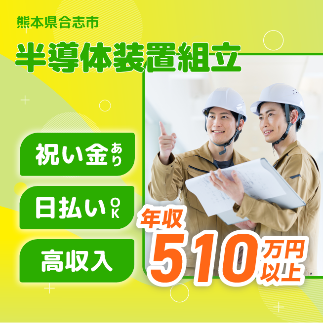 給与詳細 年収例 6,475,080円 月収例 539,590円 勤務地 熊本県合志市 仕事内容 半導体製造装置の組立・据付・調整・検査業務(半導体製造装置スタートアップ業務)