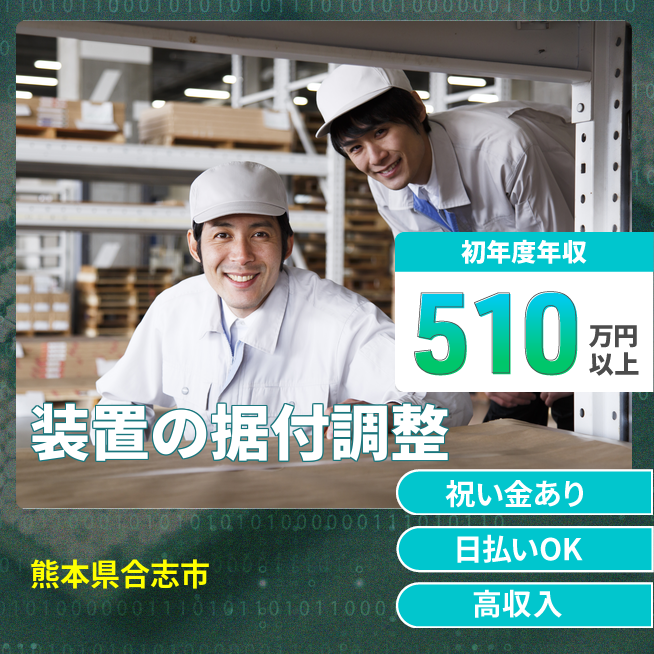 ★2026年5月末迄入社の方限定、入社祝い金40万円支給(社内規定有) 交通費 支給あり 応募の流れ 本ページ内<応募する>ボタンより、必要項目をご入力の上、ご応募ください。 勤務地 【勤務地】熊本県合志市福原 勤務時間 【勤務地】①09:00~17:45