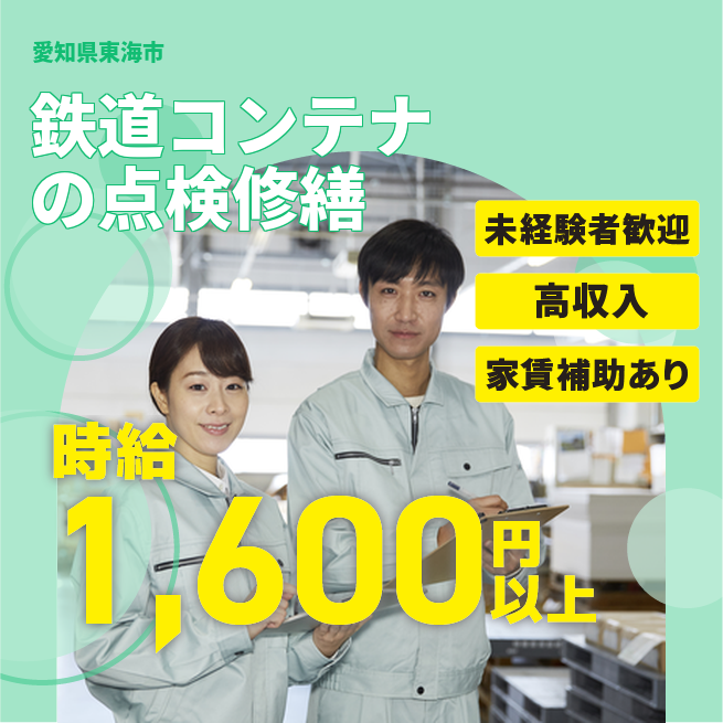 給与詳細 月収例 260,000円 時給例 1,625円 勤務地 愛知県名古屋市港区 仕事内容 ウィルオブ・ワークの正社員として取引先の貨物駅構内にて勤務いただきます。