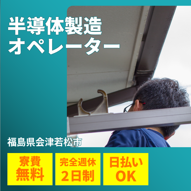 給与詳細 月収例 250,000円 日給例 11,200円 勤務地 福島県会津若松市 仕事内容 【半導体ウエハの製造】