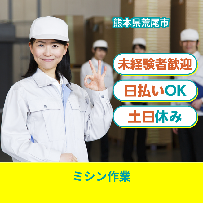 給与詳細 月収例 210,000円 時給例 1,100円 勤務地 熊本県荒尾市 仕事内容 【ミシン作業】
