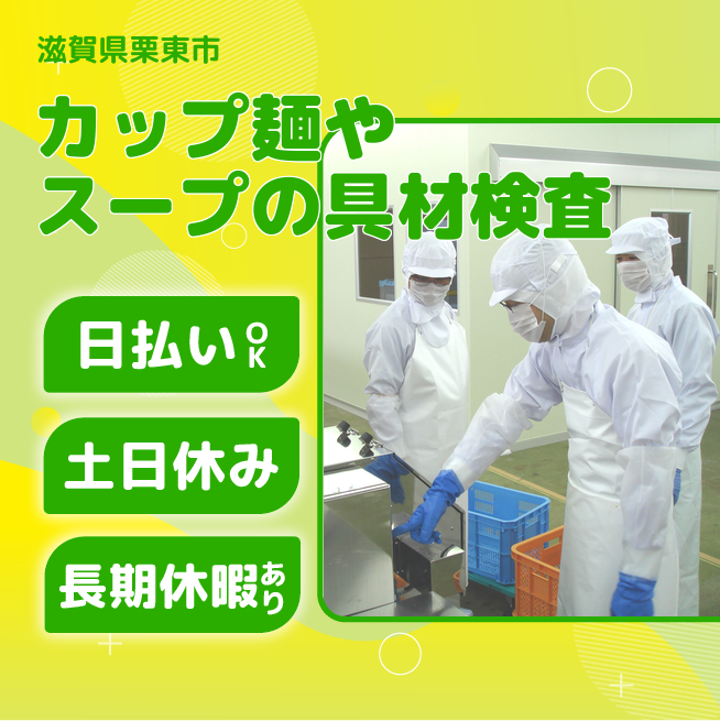 給与詳細 月収例 280,000円 時給例 1,200円 勤務地 滋賀県栗東市 仕事内容 【カップ麺やスープの具材検査】