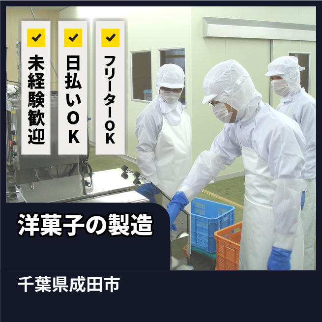 給与詳細 月収例 240,000円 日給例 11,200円 勤務地 千葉県成田市 仕事内容 【洋菓子の製造】
