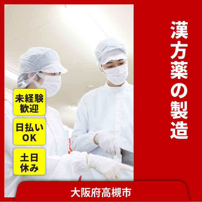 給与詳細 月収例 260,000円 日給例 12,000円 勤務地 大阪府高槻市 仕事内容 【漢方薬の製造】