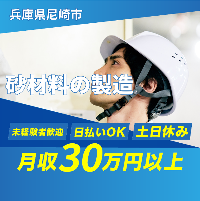 給与詳細 月収例 300,000円 日給例 12,000円 勤務地 兵庫県尼崎市 仕事内容 【砂材料の製造】