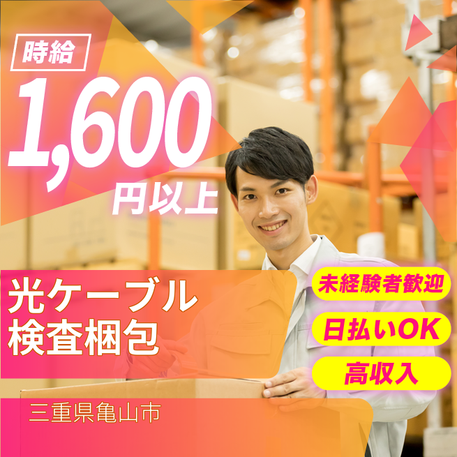 給与詳細 月収例 267,200円 時給例 1,670円 勤務地 三重県亀山市 仕事内容 光ファイバーケーブルの検査・梱包作業(交通費支給/駐車場無料)