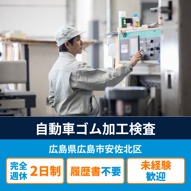 給与詳細 月収例 260,000円 日給例 13,000円 勤務地 広島県広島市安佐北区 仕事内容 自動車用ゴム製品の加工・検査業務を担当していただきます。主な作業は、ゴム製部品の成形後のバリ取り、寸法確認、外観検査、仕上げ処理などの軽作業が中心です。6時間は軽負荷の単純作業、残り2時間は製品の選別や工程補助作業を行います。