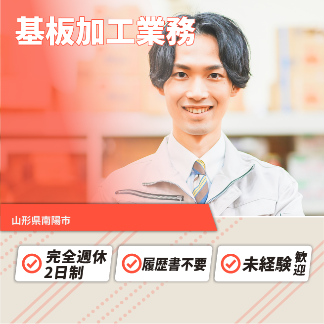 給与詳細 月収例 150,000円 時給例 1,050円 勤務地 山形県南陽市 仕事内容 【業務内容】電子機器用基板の製造と検査を担当するお仕事です。