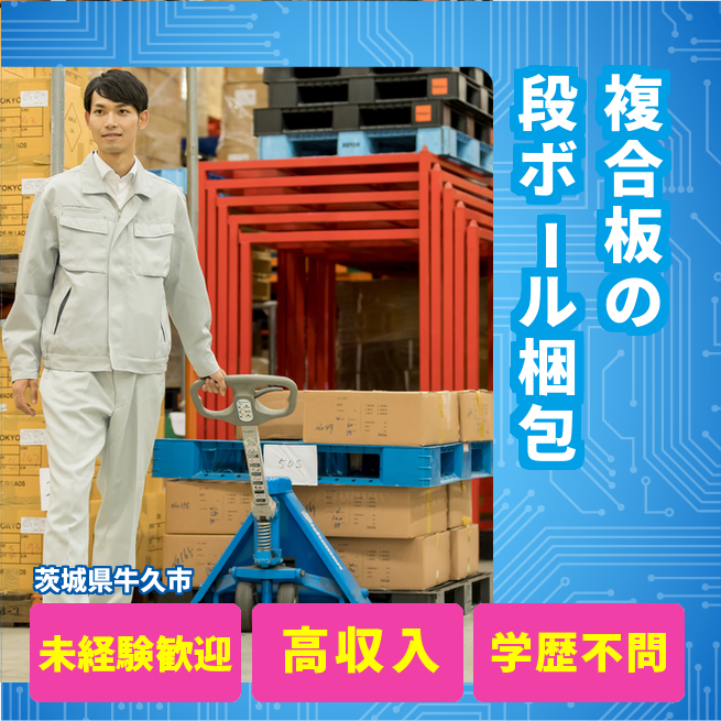 給与詳細 月収例 224,000円 日給例 11,200円 勤務地 茨城県牛久市 仕事内容 【複合板の段ボール梱包】