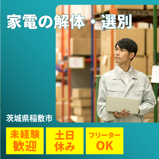 給与詳細 月収例 216,000円 日給例 10,800円 勤務地 茨城県稲敷市 仕事内容 【製品の解体・選別作業】
