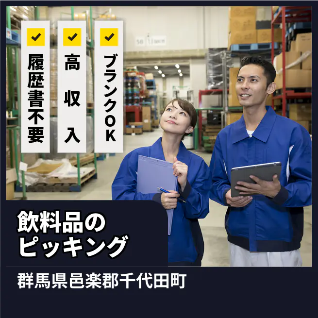 給与詳細 月収例 178,000円 時給例 1,400円 勤務地 群馬県邑楽郡千代田町 仕事内容 【業務内容】飲料品の倉庫内ピッキング作業