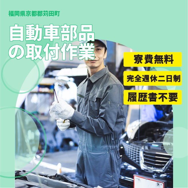 給与詳細 月収例 310,000円 日給例 15,500円 勤務地 福岡県京都郡苅田町 仕事内容 自動車の座席(シート)をつくるお仕事です。