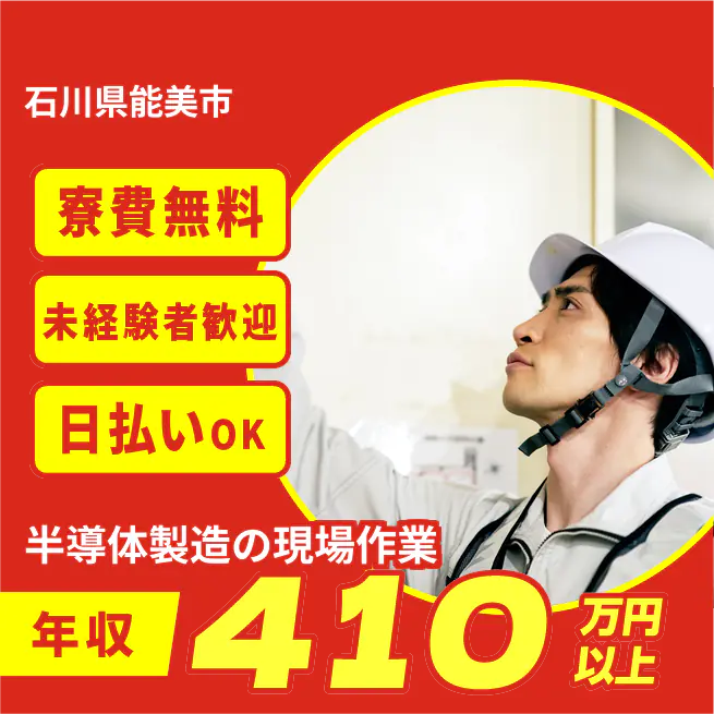 ・特になし 福利厚生 交通費:上限3万円迄/月 公開日 2025年02月01日 寮 部屋タイプ 個室寮 家具・備品 初めての一人暮らしでも安心♪生活に必要な備品はあらかじめそろっています。※寮による 家賃 無料 その他 寮周辺にはスーパーやコンビニもあり生活も便利!※寮による ★日払い制度あり!