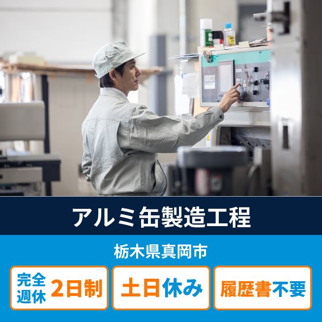 給与詳細 月収例 208,000円 日給例 10,400円 勤務地 栃木県真岡市 仕事内容 アルミ缶の製造 梱包・焼付工程