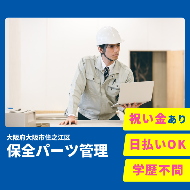 給与詳細 月収例 213,374円 日給例 11,200円 勤務地 大阪府大阪市住之江区 仕事内容 保全用パーツの管理業務
