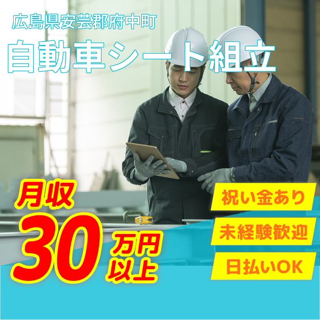 給与詳細 月収例 300,512円 日給例 10,560円 勤務地 広島県安芸郡府中町 仕事内容 自動車シートの組立・OP・検査・供給