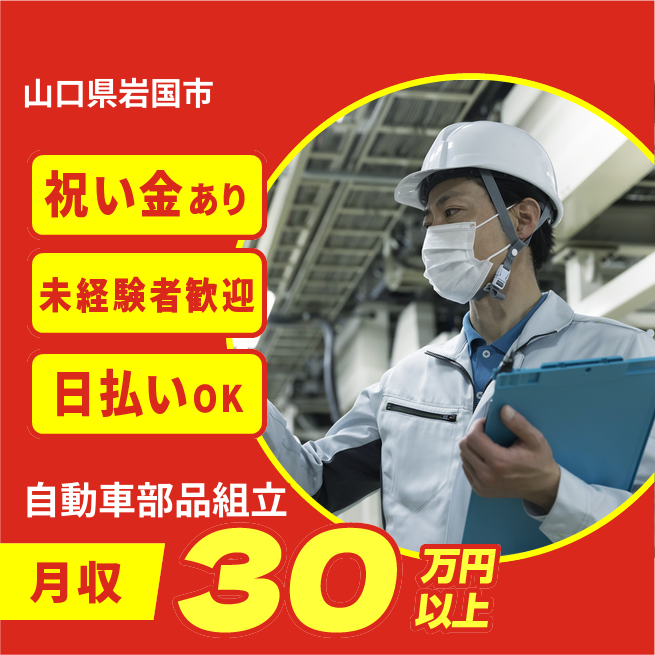 給与詳細 月収例 300,512円 日給例 10,560円 勤務地 山口県岩国市 仕事内容 自動車部品のOP・検査