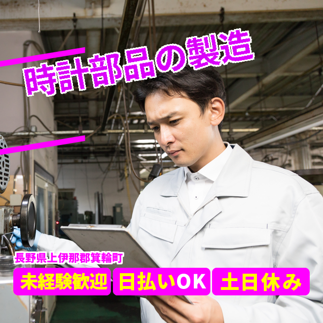 給与詳細 月収例 230,000円 日給例 10,000円 勤務地 長野県上伊那郡箕輪町 仕事内容 【時計の部品製造】