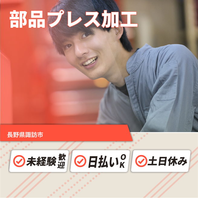 給与詳細 月収例 250,000円 日給例 10,000円 勤務地 長野県諏訪市 仕事内容 【部品のプレス加工】