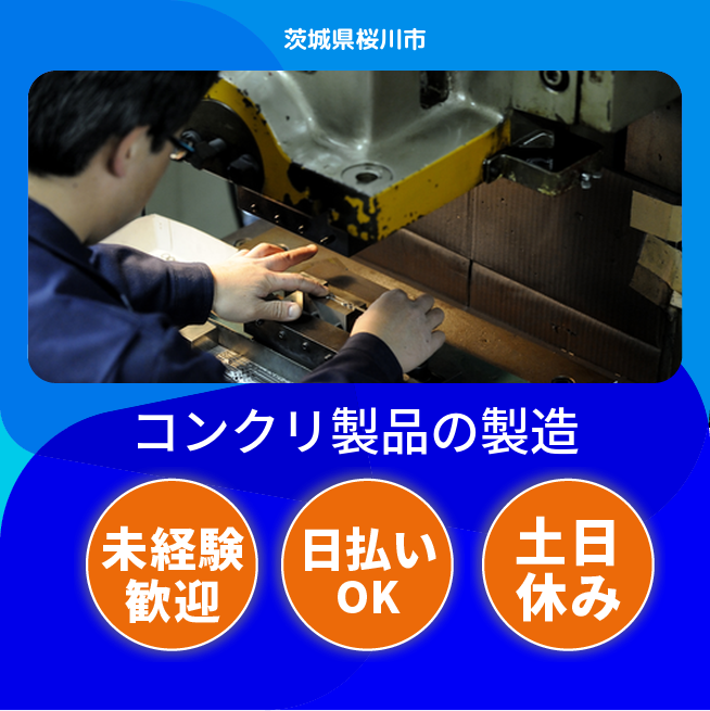 給与詳細 月収例 220,000円 日給例 10,400円 勤務地 茨城県桜川市 仕事内容 【コンクリート製品製造】
