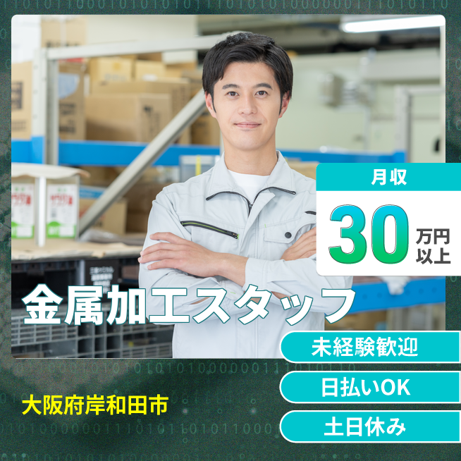 給与詳細 月収例 300,000円 日給例 11,600円 勤務地 大阪府岸和田市 仕事内容 【業務内容】 金属部品の加工