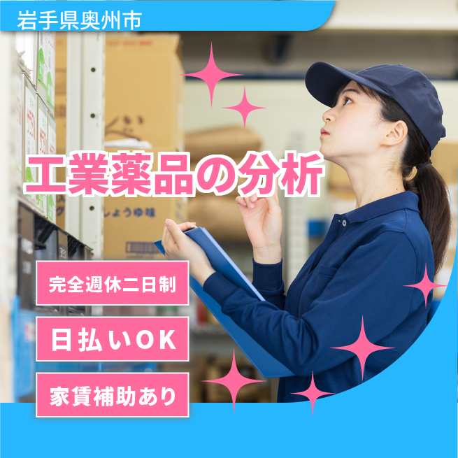 給与詳細 月収例 195,000円 時給例 1,200円 勤務地 岩手県奥州市 仕事内容 【工業薬品・試薬の製造】