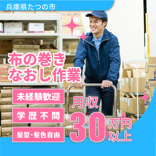 給与詳細 月収例 302,040円 日給例 12,000円 勤務地 兵庫県たつの市 仕事内容 専用の機械を用いて、鉄の棒に巻かれた布をしわがつかないように綺麗に伸ばしながら巻きなおす作業をお願いします。