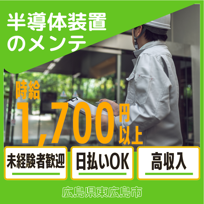 給与詳細 月収例 299,200円 時給例 1,700円 勤務地 広島県東広島市 仕事内容 【半導体製造装置メンテナンス作業】