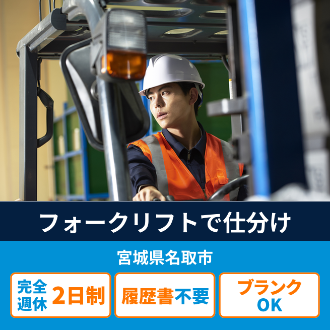 給与詳細 月収例 215,000円 日給例 10,750円 勤務地 宮城県名取市 仕事内容 【業務内容】フォークリフトを使用したエアコンと給湯器の仕分け・出荷作業