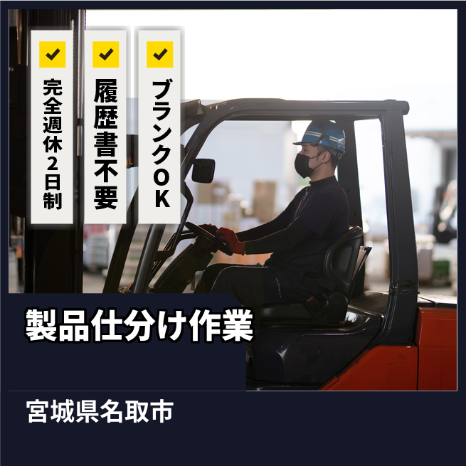 給与詳細 月収例 215,000円 日給例 10,750円 勤務地 宮城県名取市 仕事内容 【業務内容】フォークリフトを使用した製品の仕分けと出荷作業
