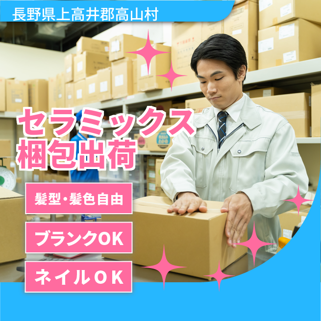 給与詳細 月収例 18,720円 時給例 1,170円 勤務地 長野県上高井郡高山村 仕事内容 ファインセラミックス製品の包装梱包出荷