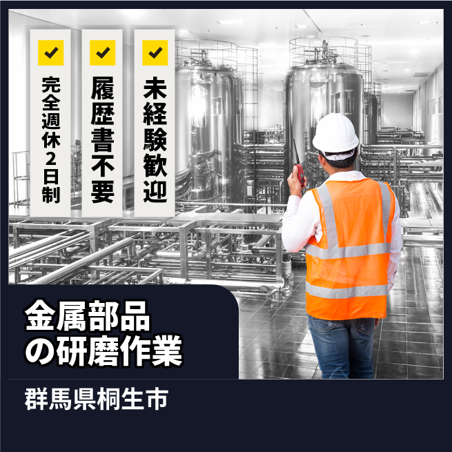 給与詳細 月収例 235,950円 時給例 1,210円 勤務地 群馬県桐生市 仕事内容 金属部品の研磨・バリ取り作業・検査。ひとりでもくもくと作業が行えます!