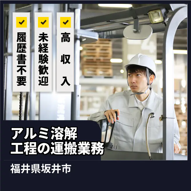 給与詳細 月収例 310,000円 日給例 15,500円 勤務地 福井県坂井市 仕事内容 【業務内容】アルミ溶解工程におけるフォークリフト操作と設備管理