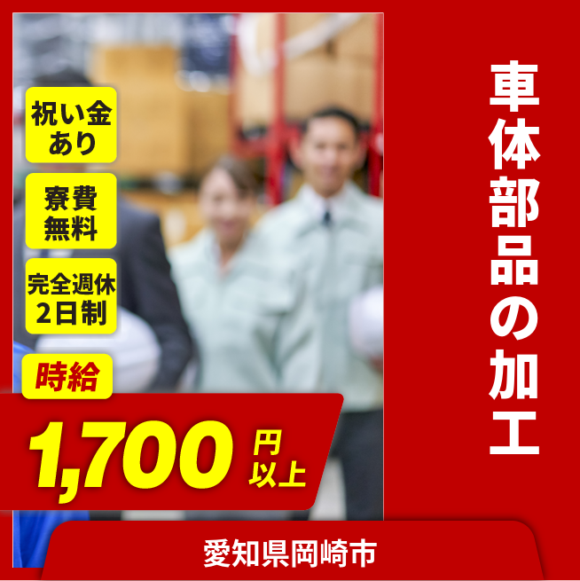 給与例は概算での計算となります。※実際と異なるケースもございます。 交通費 支給あり 応募の流れ 本ページ内<応募する>ボタンより、必要項目をご入力の上、ご応募ください。 勤務地 【勤務地】愛知県岡崎市- 勤務時間 【勤務地】【勤務時間】
