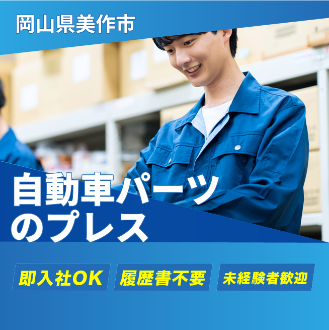 給与詳細 月収例 185,808円 時給例 1,120円 勤務地 岡山県美作市 仕事内容 自動車部品のプレス・軽作業/土日休
