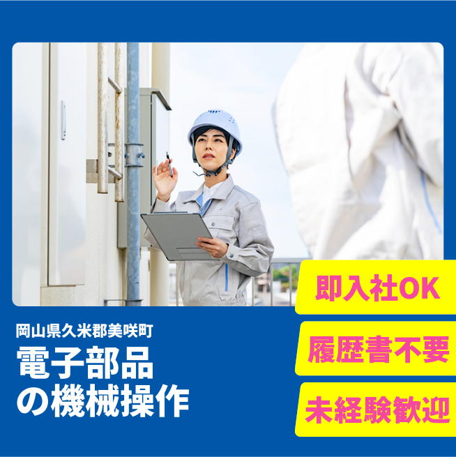 給与詳細 月収例 210,000円 日給例 10,000円 勤務地 岡山県久米郡美咲町 仕事内容 電子部品の製造機械オペレーター/交代