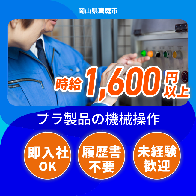 給与詳細 月収例 259,875円 時給例 1,650円 勤務地 岡山県真庭市 仕事内容 プラスチック製品の機械オペレーター