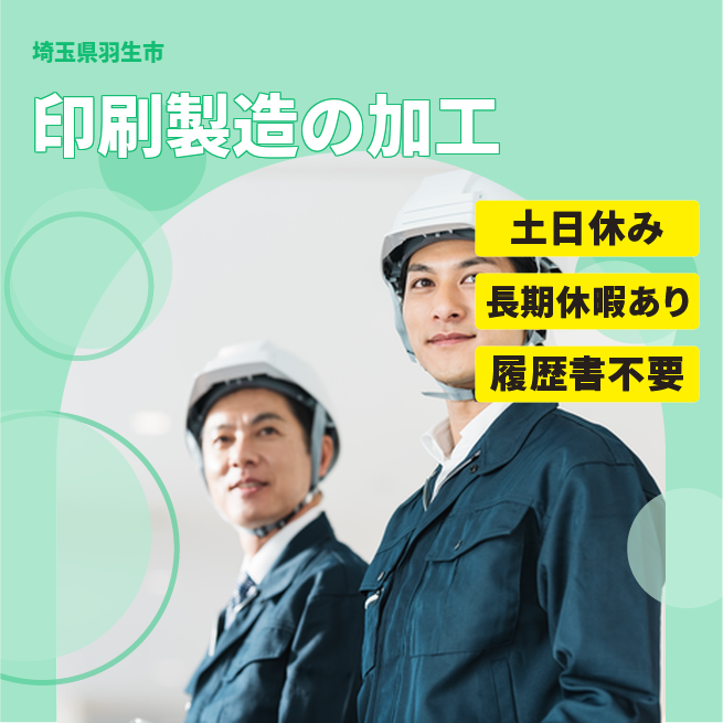 給与詳細 月収例 230,000円 日給例 11,500円 勤務地 埼玉県羽生市 仕事内容 ウィルオブ・ワークの正社員として取引先の印刷製造工場にて勤務いただきます。