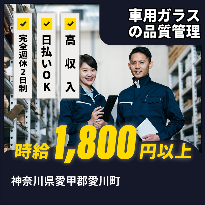 給与詳細 月収例 292,000円 時給例 1,800円 勤務地 神奈川県愛甲郡愛川町 仕事内容 【自動車ガラス製造に関わる品質管理部署での業務】