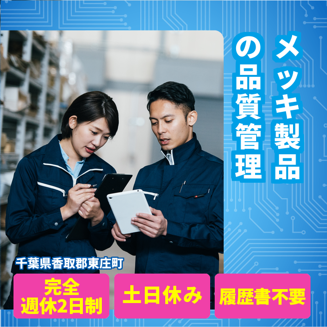 メッキ処理済みの製品の品質管理や製品の研究開発を行います。化学系のお仕事を経験されている方向け。パソコンを使った業務や、製品のチェックや開発を行う業務などがあります。