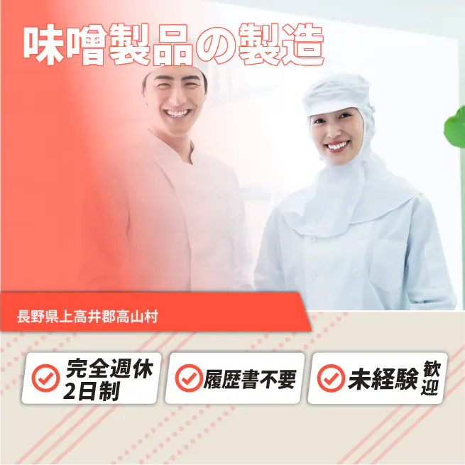 給与詳細 月収例 154,000円 時給例 1,100円 勤務地 長野県上高井郡高山村 仕事内容 【業務内容】味噌や関連製品の製造