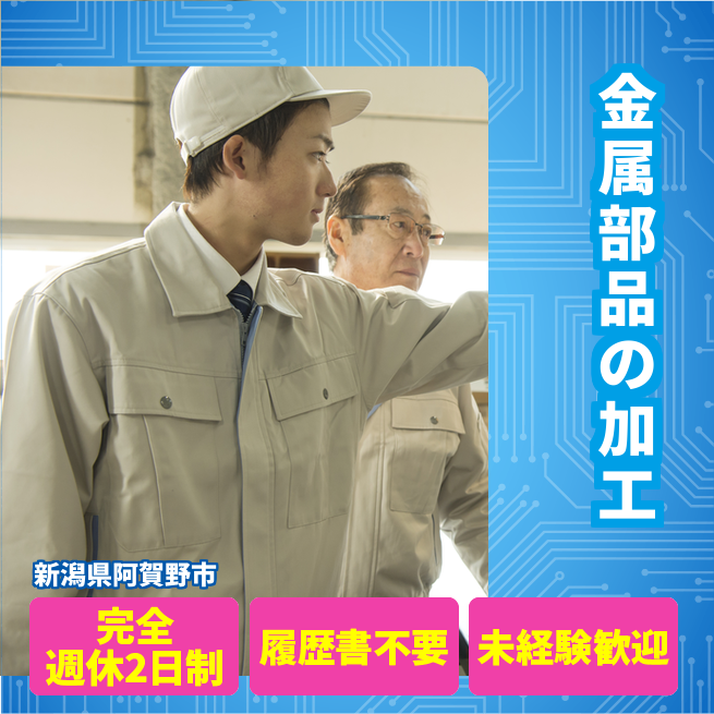 給与詳細 月収例 234,000円 時給例 1,200円 勤務地 新潟県阿賀野市 仕事内容 ①円筒状の金属部品の機械加工・部品の着脱・検査をしていただくお仕事です。