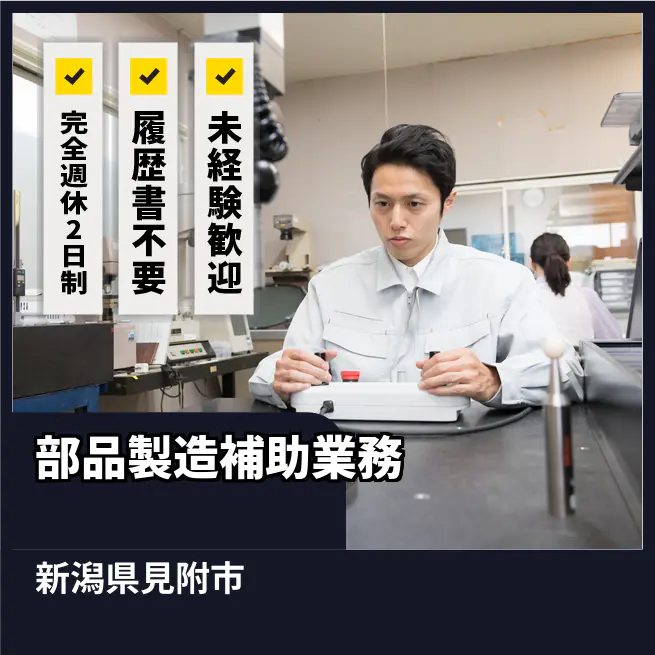 給与詳細 月収例 234,000円 時給例 1,200円 勤務地 新潟県見附市 仕事内容 【業務内容】電子部品の製造加工と検査のサポート業務