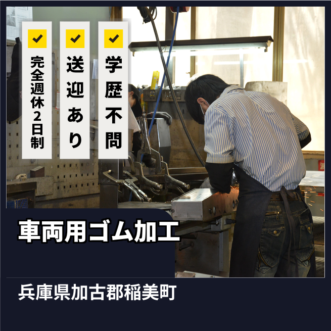 車両用防振ゴム 加工業務。ゴム成形業務 (ゴム素材をセットしプレスをする業務です)。金型の交換等もあります。加硫加工機のオペレーター業務