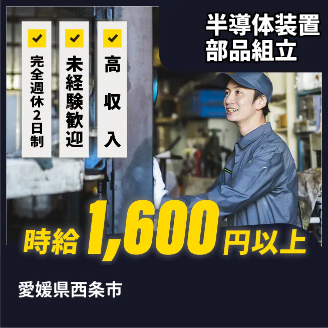 残業:1,750×5H=8,750円 計232,750円 交通費 支給あり 応募の流れ 本ページ内<応募する>ボタンより、必要項目をご入力の上、ご応募ください。 勤務地 【勤務地】愛媛県西条市今在家 勤務時間 【勤務地】8:00~16:45(休憩45分 実働8時間) 必須資格 ●未経験者大歓迎