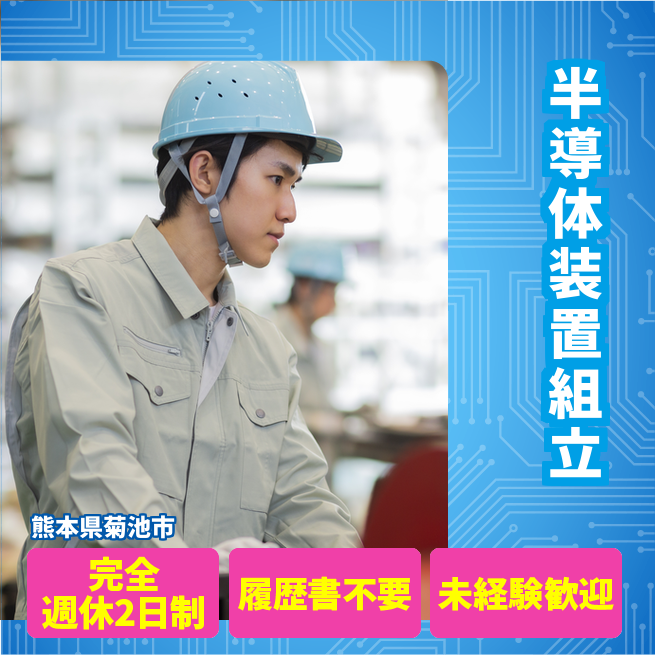 給与詳細 月収例 300,000円 日給例 15,000円 勤務地 熊本県菊池市 仕事内容 半導体製造装置の組立作業